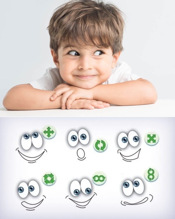 Поднять глаза вверх, вправо, вниз, влево и вверх; и обратно: влево, вниз, вправо и снова вверх; (совершенствует сложные движения глаз).